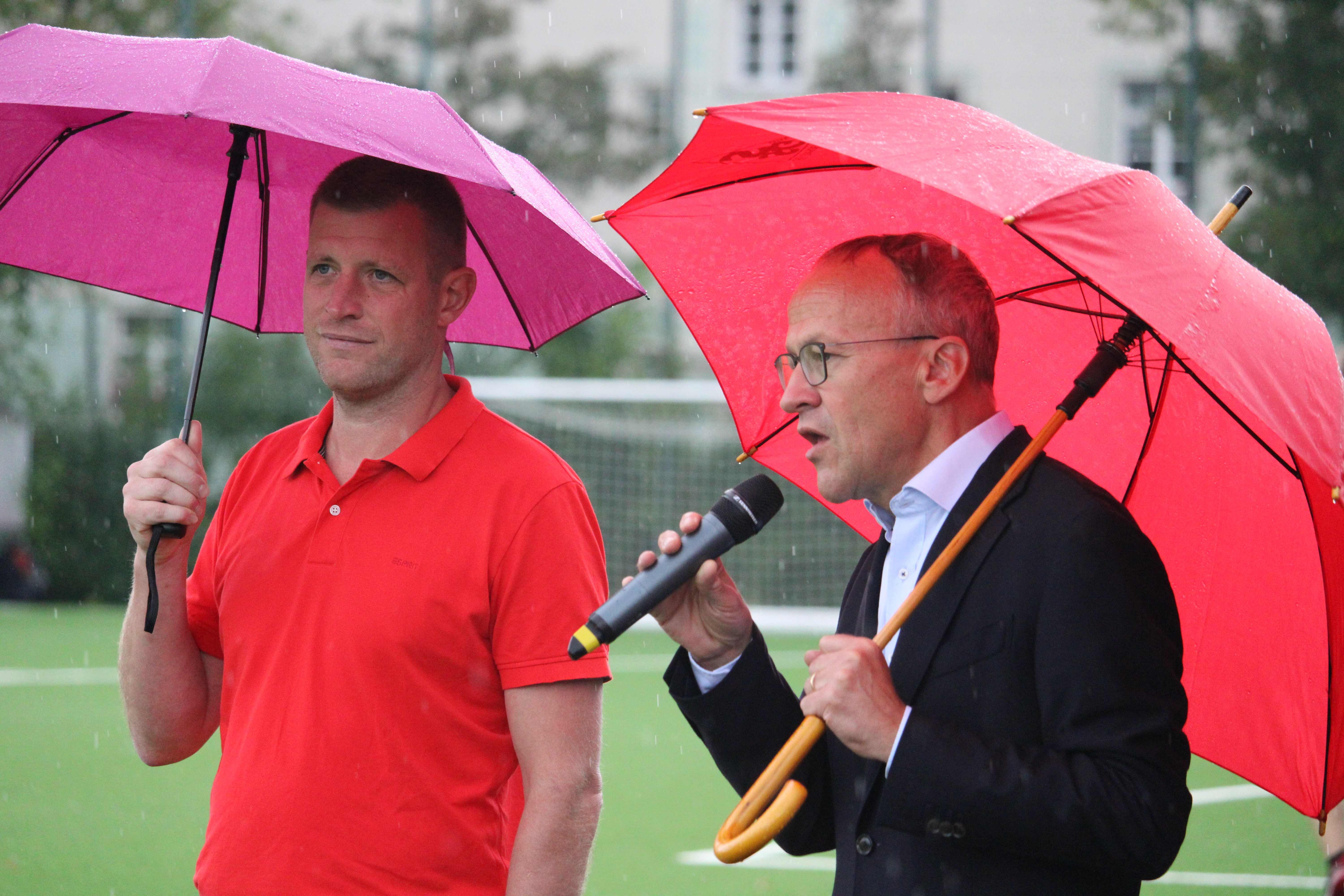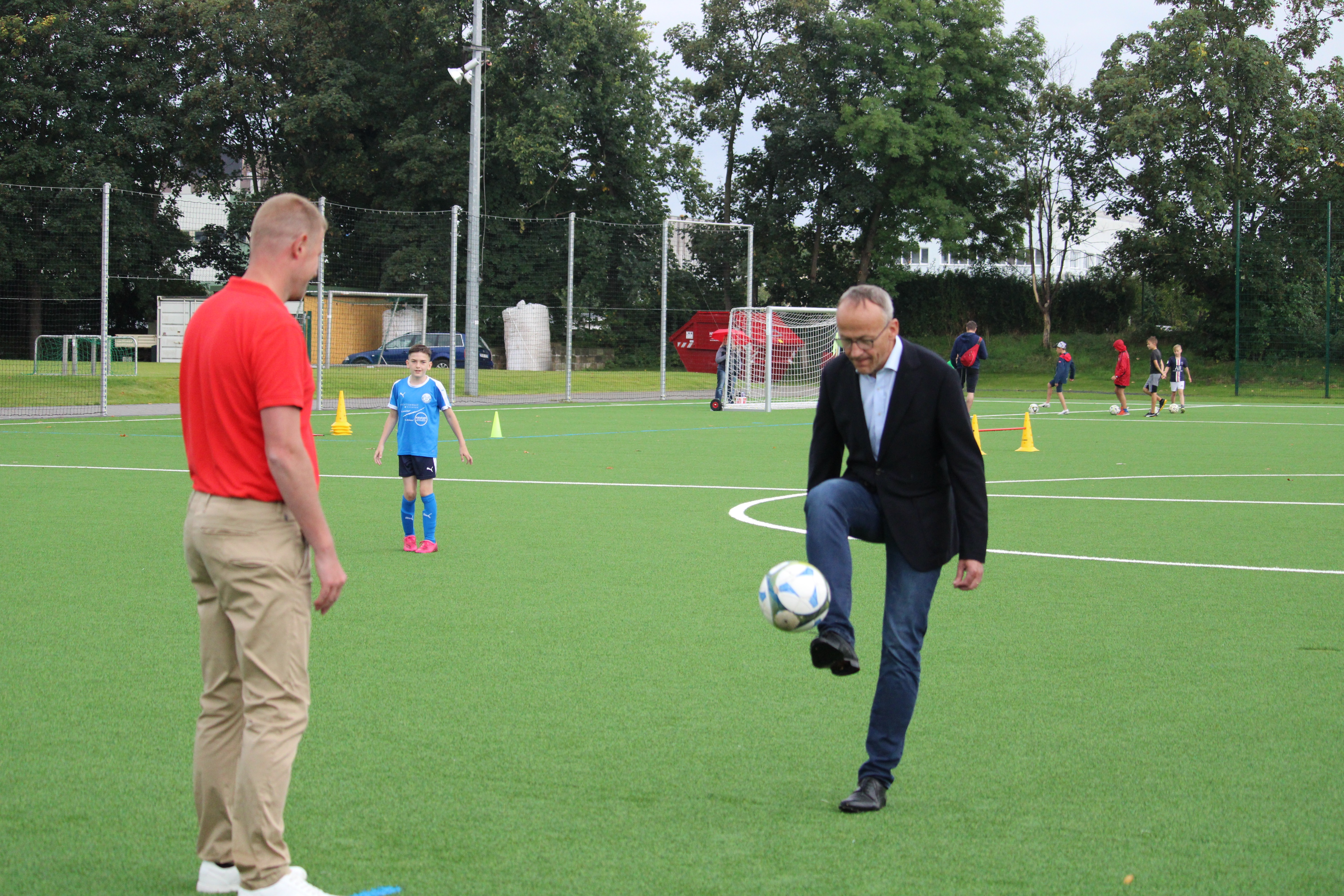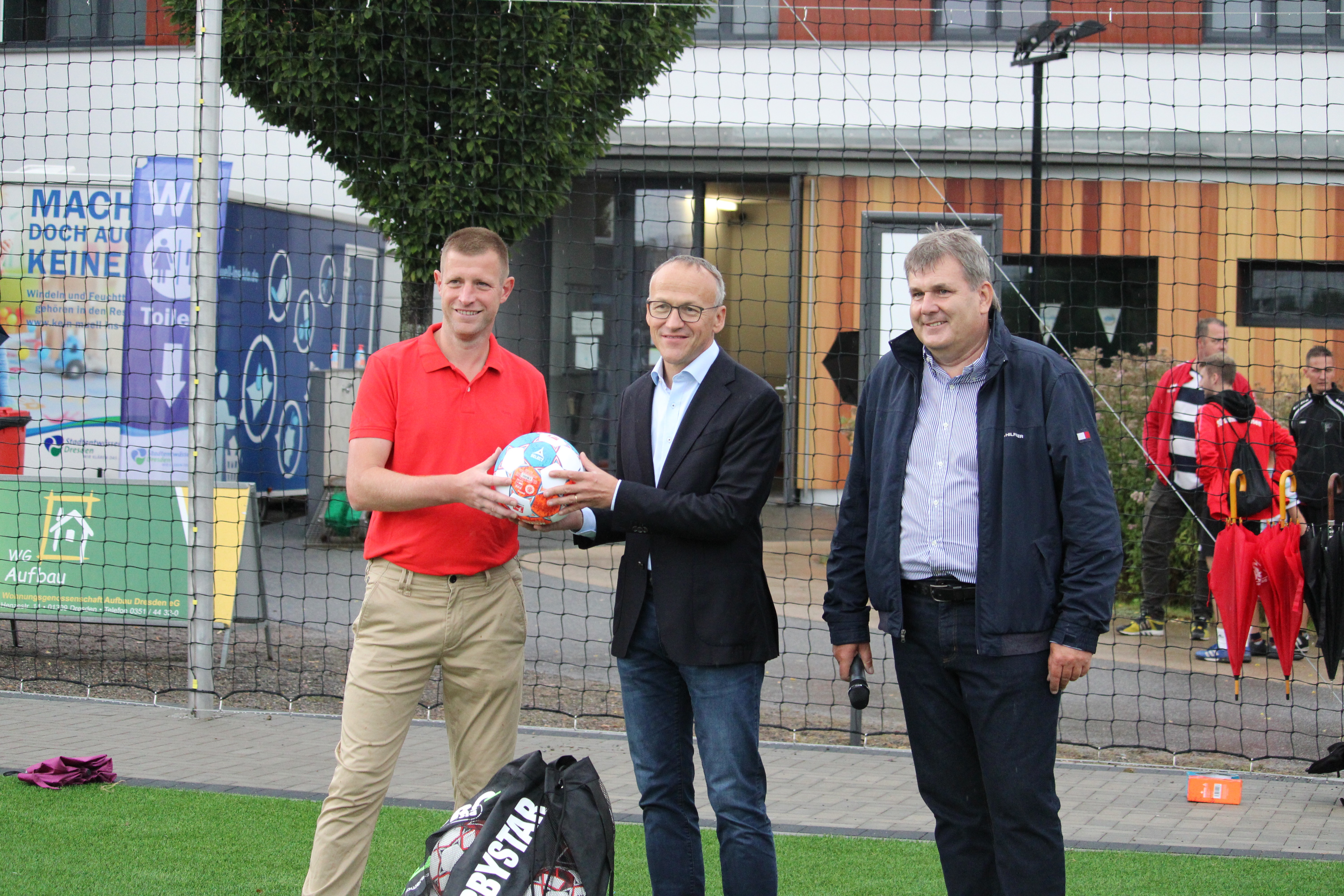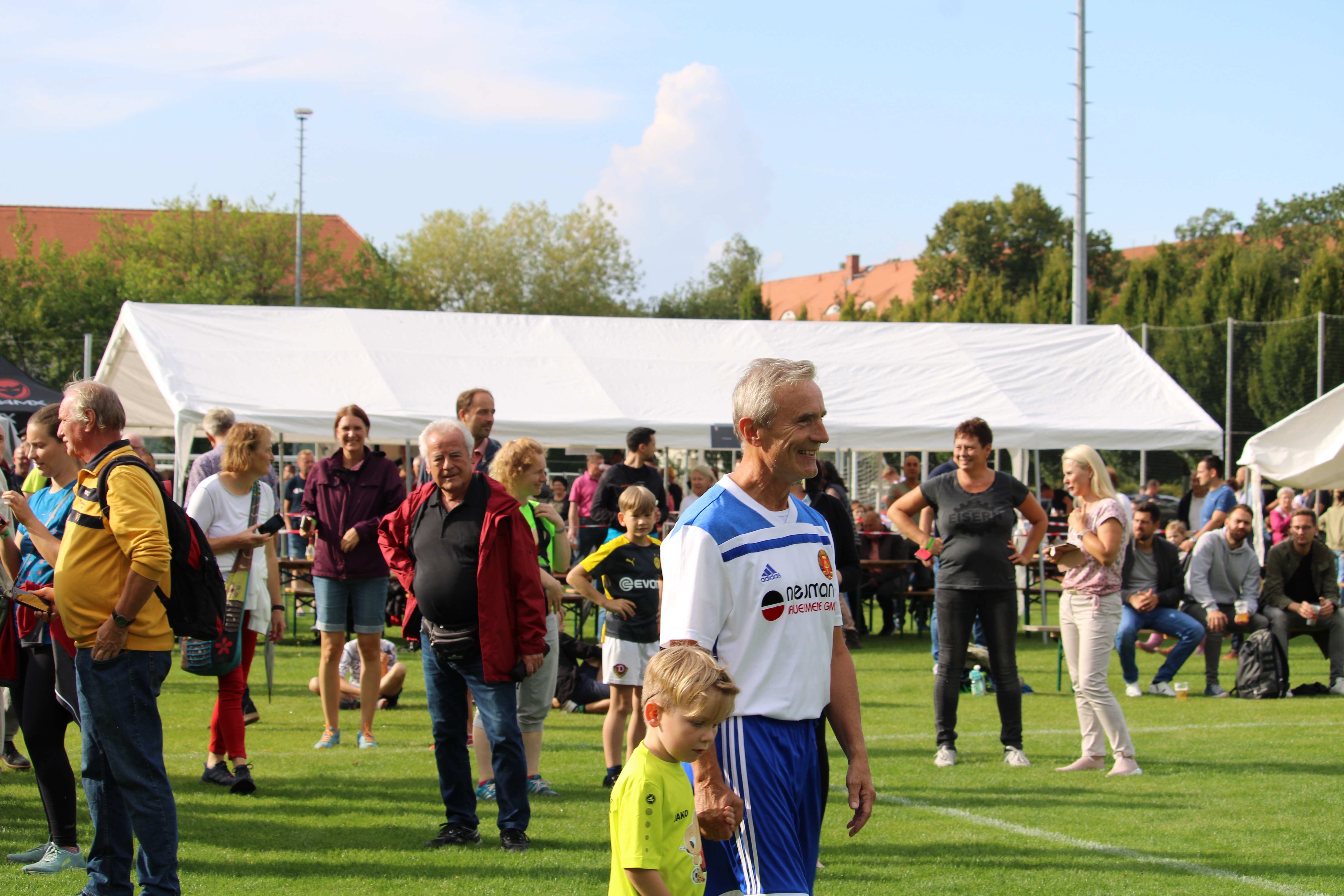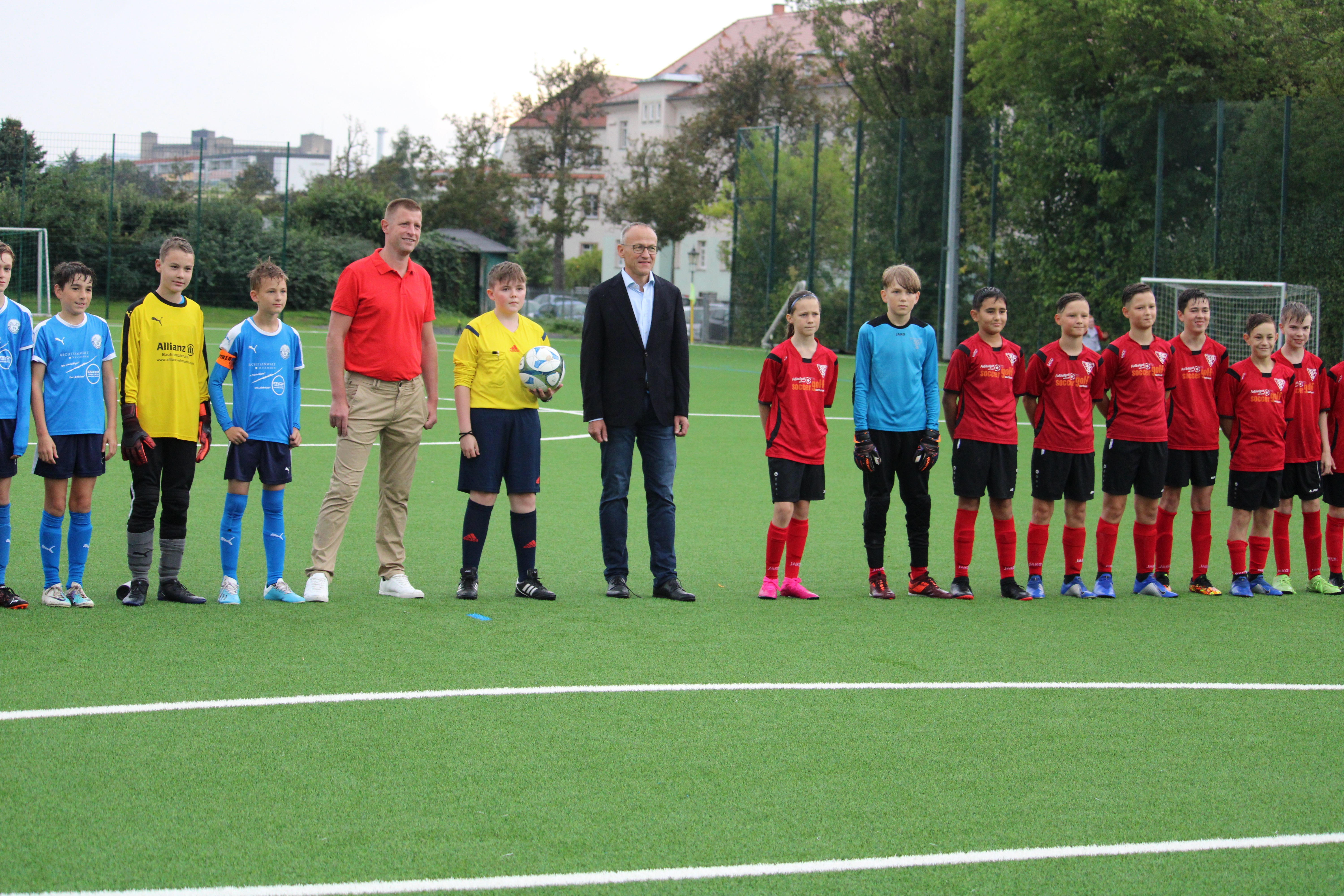 14:00 Uhr richteten sich die Blicke gen Kunstrasen. Denn endlich wurde der Platz offiziell eingeweiht. Sportbürgermeister der Stadt Dresden Peter Lames und Heiko Petzold (Präsident Stadtverband Fußball Dresden) übernahmen dabei die feierliche Verantwortung. Wobei Herr Lames beim Spiel der D-Junioren auch den Ehrenanstoß ausführte.
