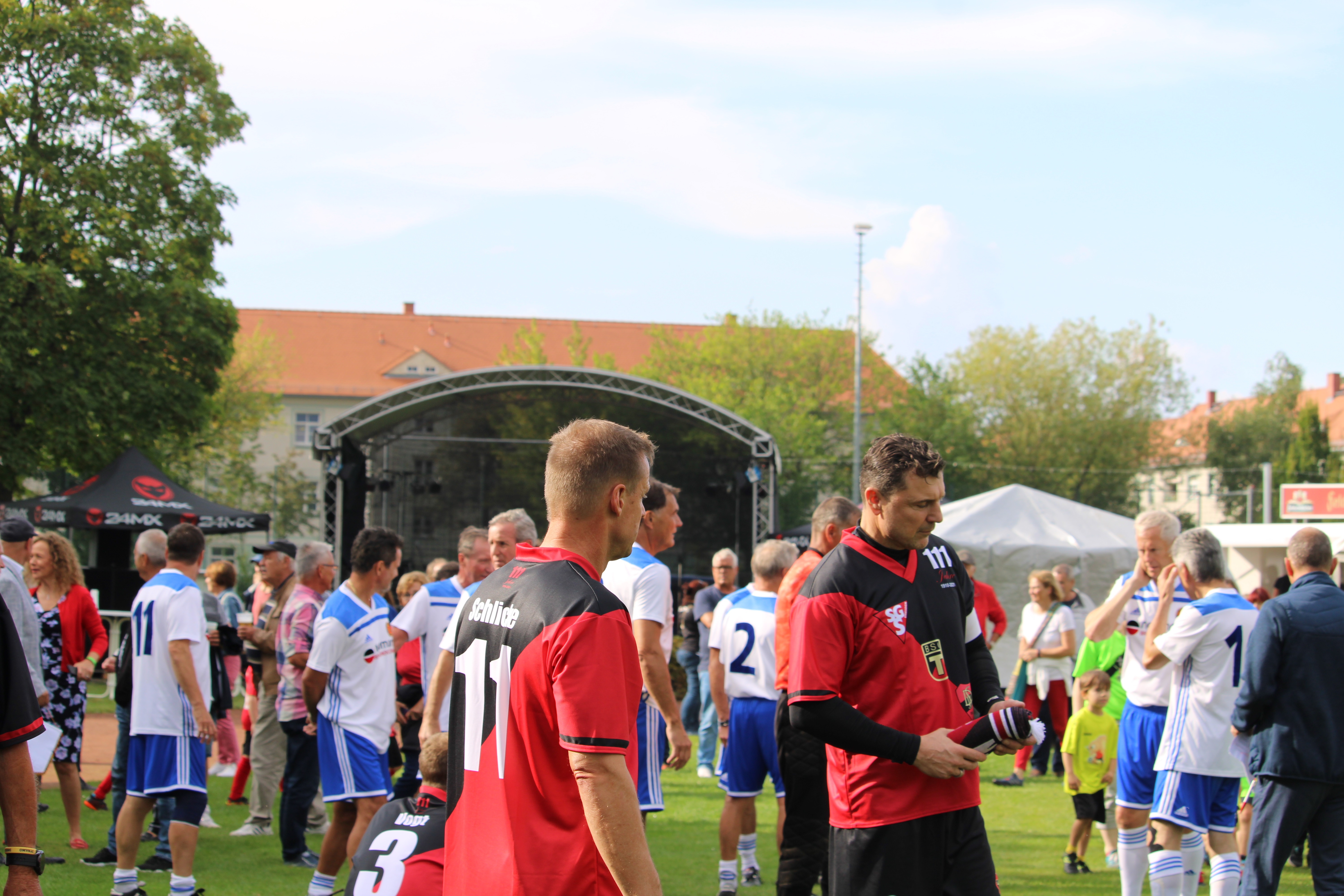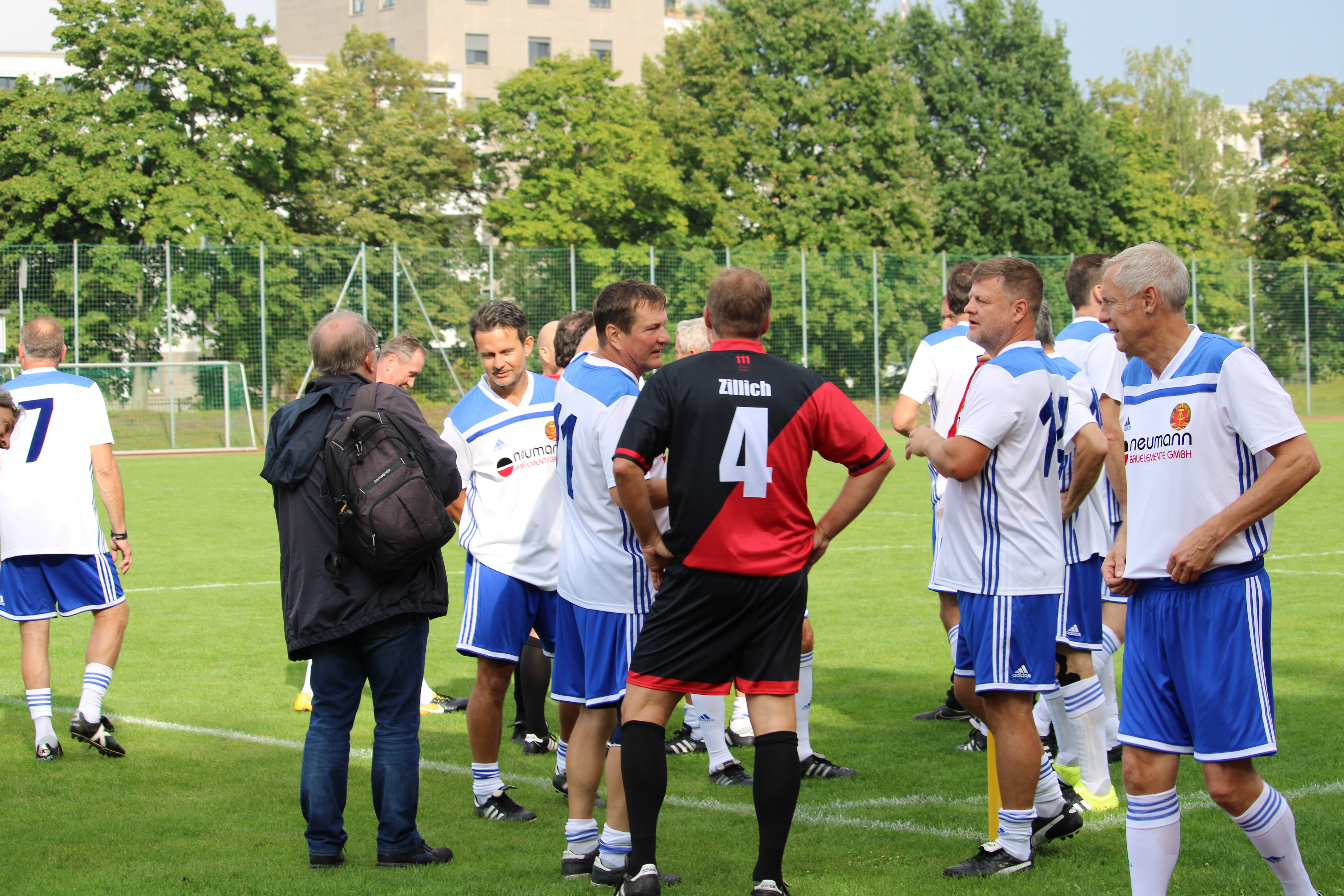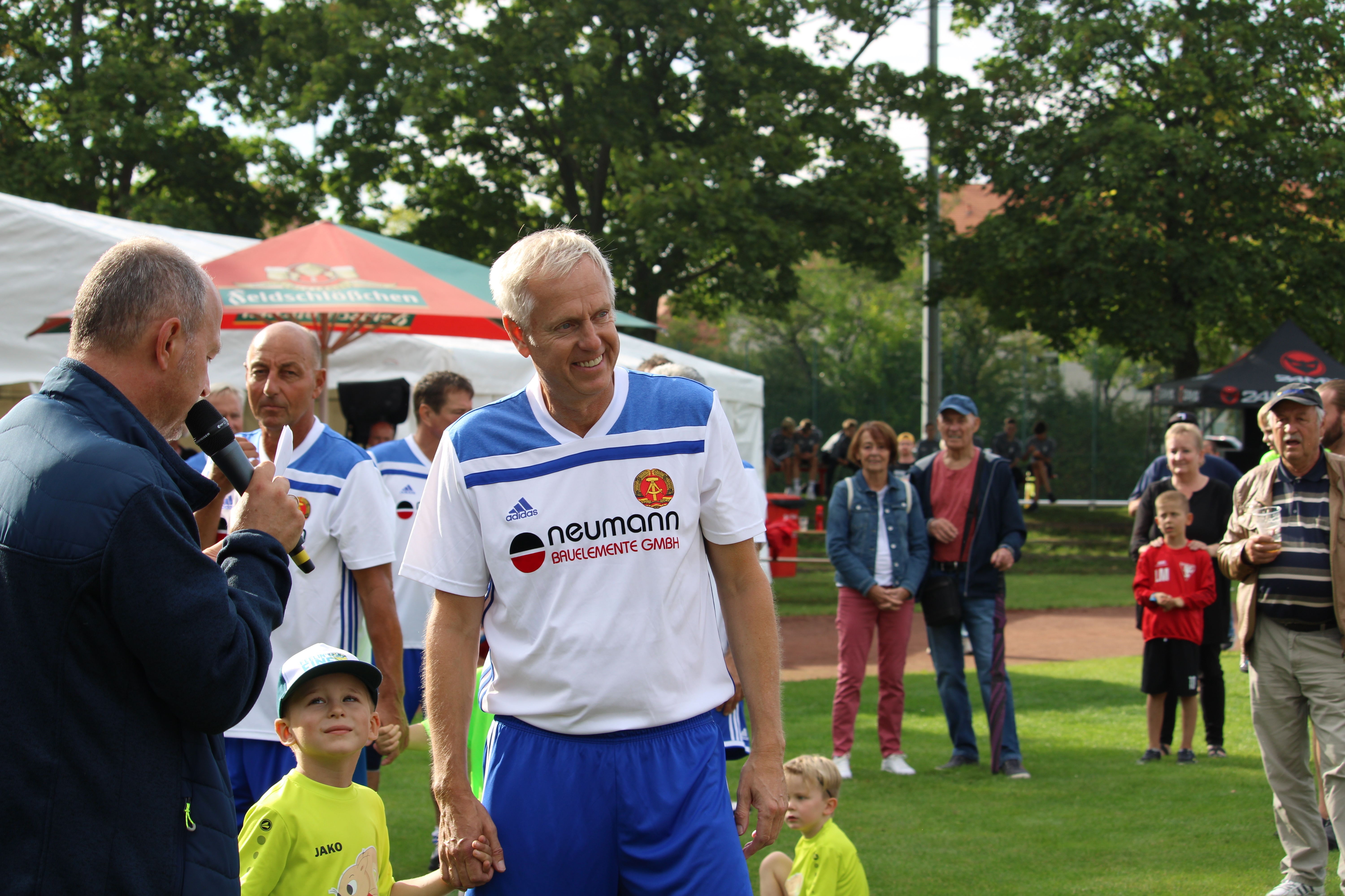 Direkt danach fand das große Spiel der Alten Herren gegen die Ostfußball-Nationalmannschaft statt. Vor dem Anstoß wurden noch unsere A- und C2-Junioren für ihre Aufstiege in die Landesklasse hochgelebt. Nach einer Vorstellung der Anwesenden DDR-Kicker startete die Partie der Alten Herren. Ein lockeres Spielchen mit einigen Toren, wenn auch mehr für die Gäste, die 6:1 gewannen.