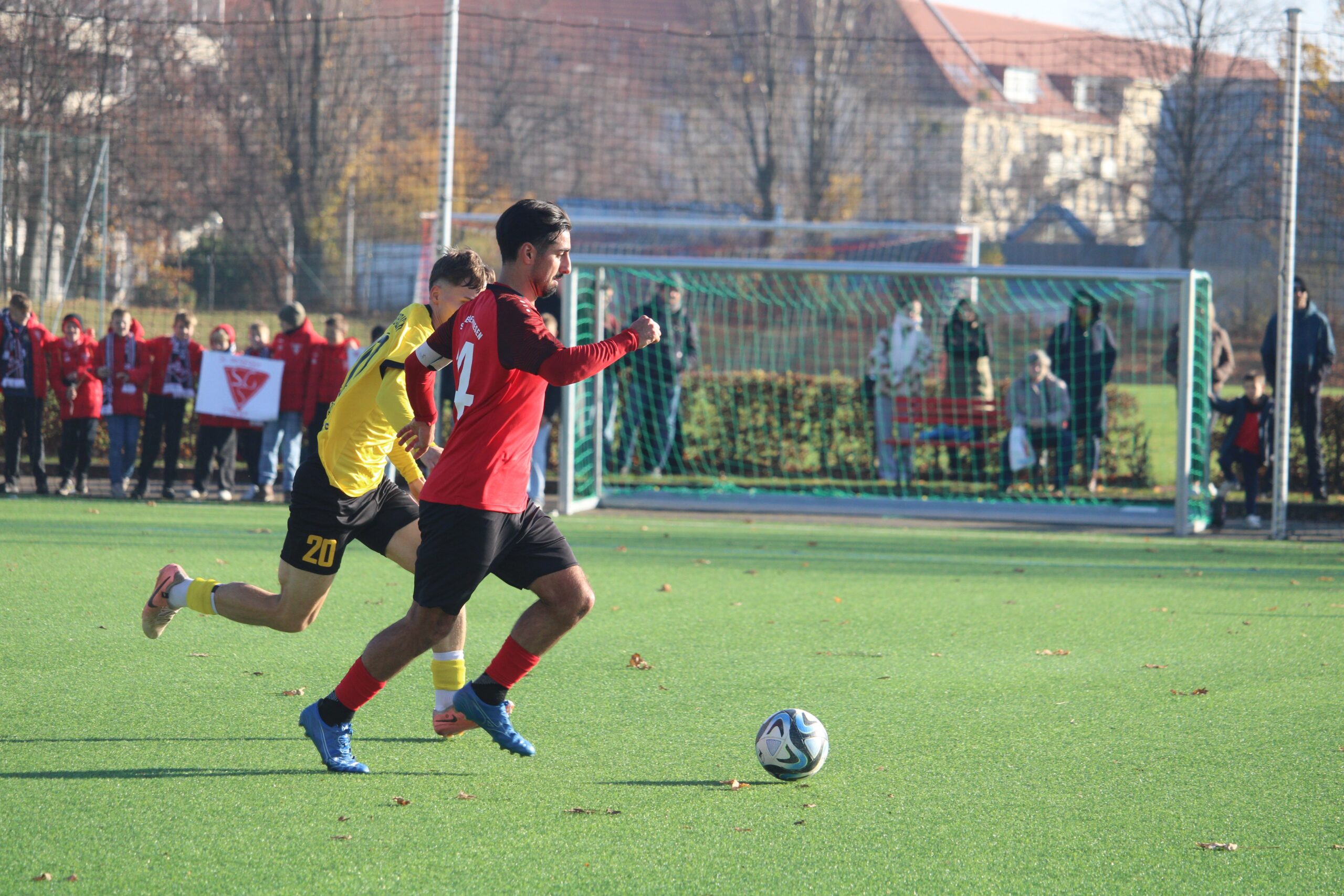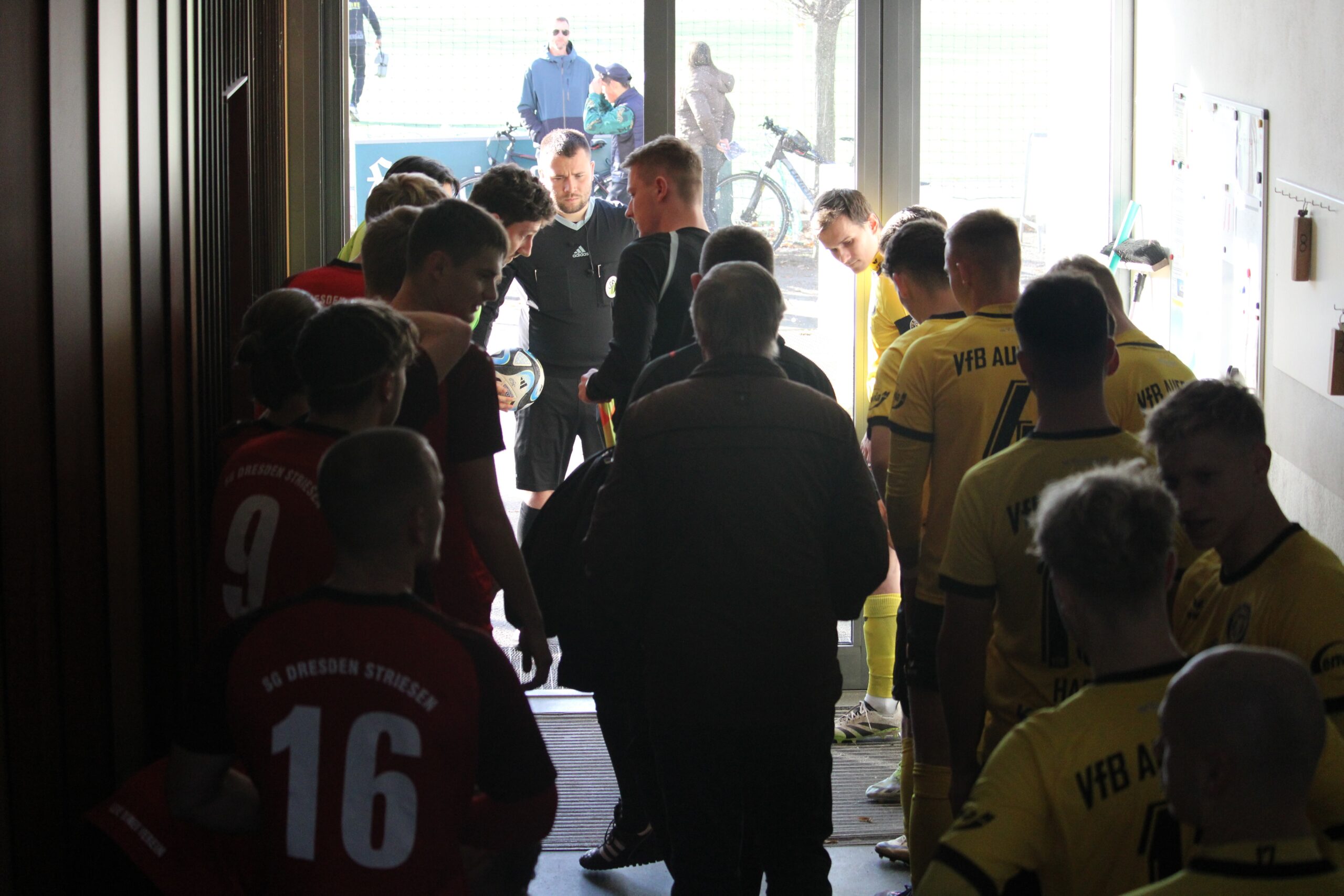 Dabei gehörte unseren Mannen die erste Torannäherung und Lorenz Thomas gab nach fünf Minuten den ersten Schuss ab. Im Anschluss übernahmen die Gäste das Heft des Handelns in die Hand und drückten unsere Mannen in die Defensive. Nach neun Minuten kamen sie zu ihrer ersten Möglichkeit, serviert auf dem Silbertablett. Ein Fehlpass im Aufbauspiel ließ die Auerbacher zum Abschluss kommen. Zwei Minuten später zeigten sich die Vogtländer dann zielsicher. Nach einem Einwurf kombinierte man sich schnell durch und schob am Ende überlegt ein (11.). Auch in der Folge waren die Gäste die Mannschaft mit dem größeren Ballbesitz, doch unsere Mannen wussten defensiv die Räume eng zu halten und so den Gästeangreifern das Leben schwer zu machen. Erst in der 26. Minute gab es wieder eine Chance. Nach einer Flanke kommt Auerbach zum Kopfball, den Yannick Born von der Linie kratzt. Fünf Minuten vor der Pause dann Thomas, der es aus der Distanz versuchte und so den Auerbacher Schlussmann zur Parade zwang. Die letzte Aktion der ersten Hälfte gehörte dem Oberligisten, der nach einer schnellen Kombination das Aluminium erzittern ließ und den Querbalken traf.