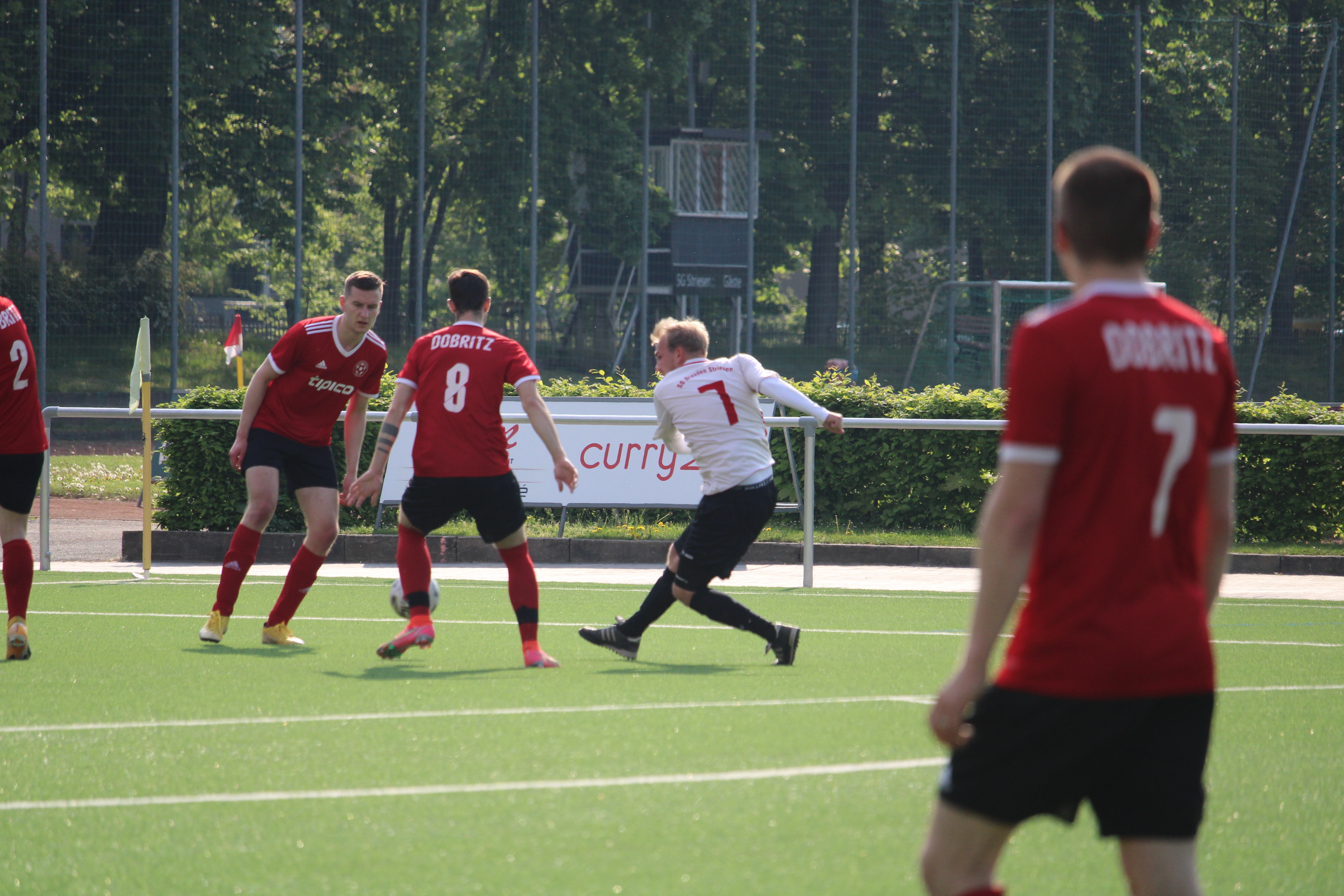 Dabei bekam man es mit der Dritten des SV Eintracht Dobritz zu tun. Ein Gegner, der unserer Dritten das Leben nicht unbedingt einfach machte. So erlebte man eine lange ausgeglichene Partie, bei der Striesen zwar ein leichtes Chancenplus für sich verzeichnete, aber nicht die Dominanz der letzten Spiele auf den Platz bringen könnte. So war der Spielstand auch lange torlos und erst als sich beide Mannschaften schon langsam auf die Pause vorbereiteten, war es Markus Weise der mit einem traumhaften Treffer von der Strafraumgrenze zur Führung traf.