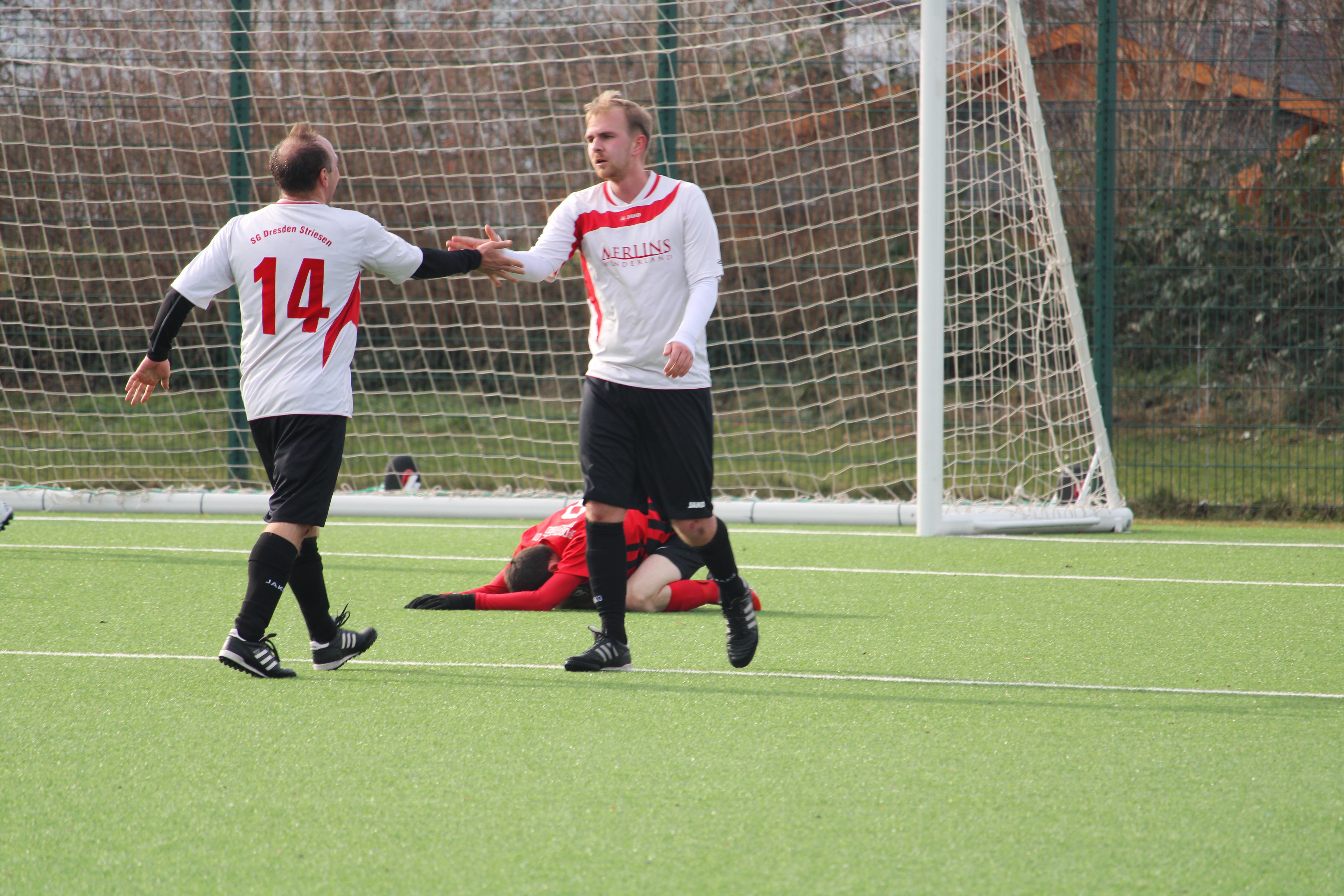 Schon der Start in die Partie war sehr verheißungsvoll. Nach nur sieben Minuten gelang es sich in den Strafraum zu spielen, wo William Brüggemann zum Frei mitgelaufenen Daniel Schneider abgelegte, der zur Führung traf. Auch im Anschluss war man das aktivere Team und versuchte direkt den nächsten Treffer nachzulegen. Doch entweder war der Abschluss zu ungenau oder man traf wie Brüggemann nur den Querbalken. Auf der anderen Seite hatten aber auch die Gäste zwei gute Möglichkeiten, scheiterten aber am glänzend reagierenden Martin Zahel im Tor. Doch im Großen und Ganzen gab weiter Striesen den Ton an und belohnte sich in der 31. Minute durch Brüggemann mit dem 2:0. Brüggemann war es dann auch, der mit dem Pausenpfiff noch den dritten Treffer nachlegte.