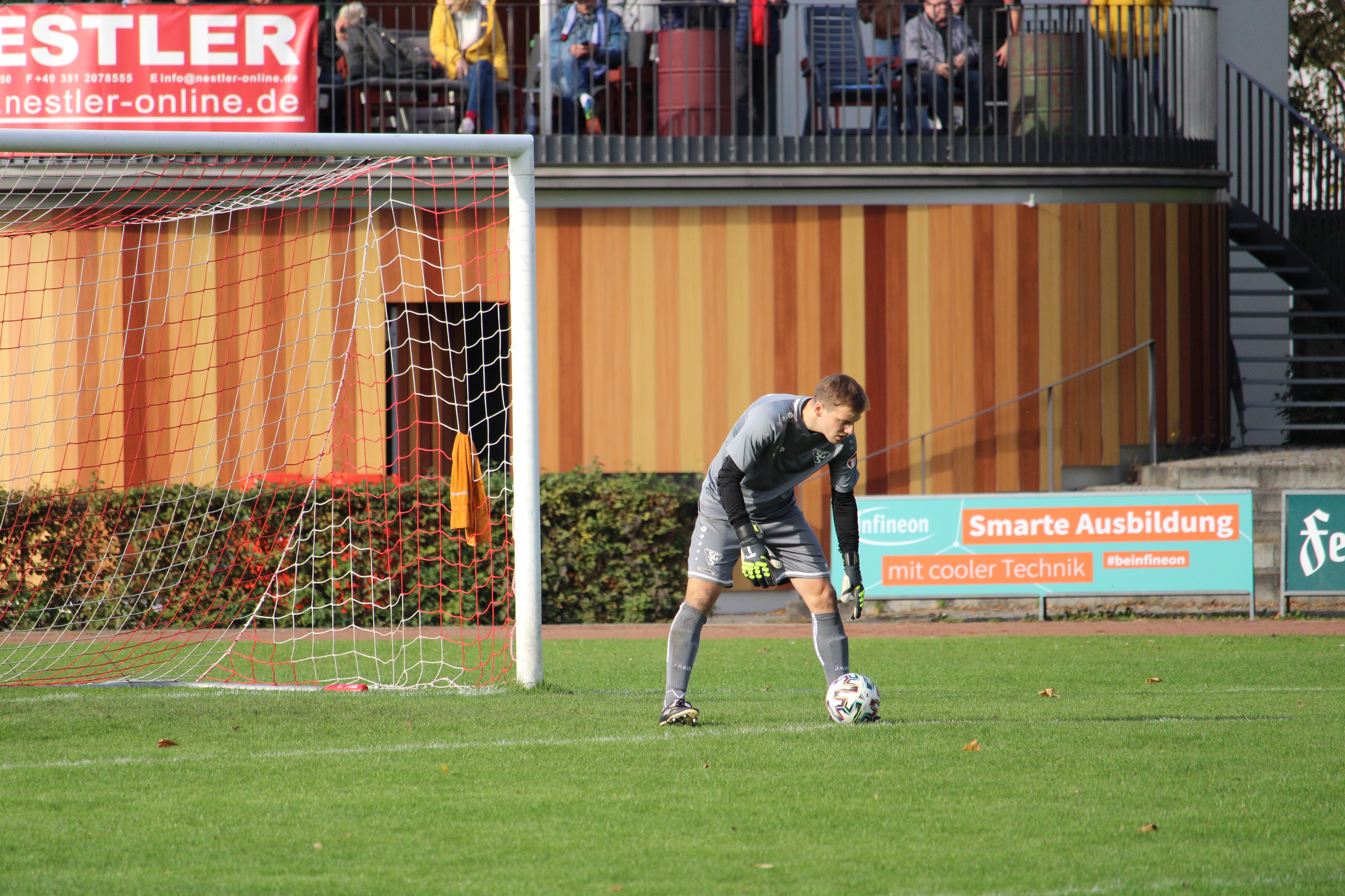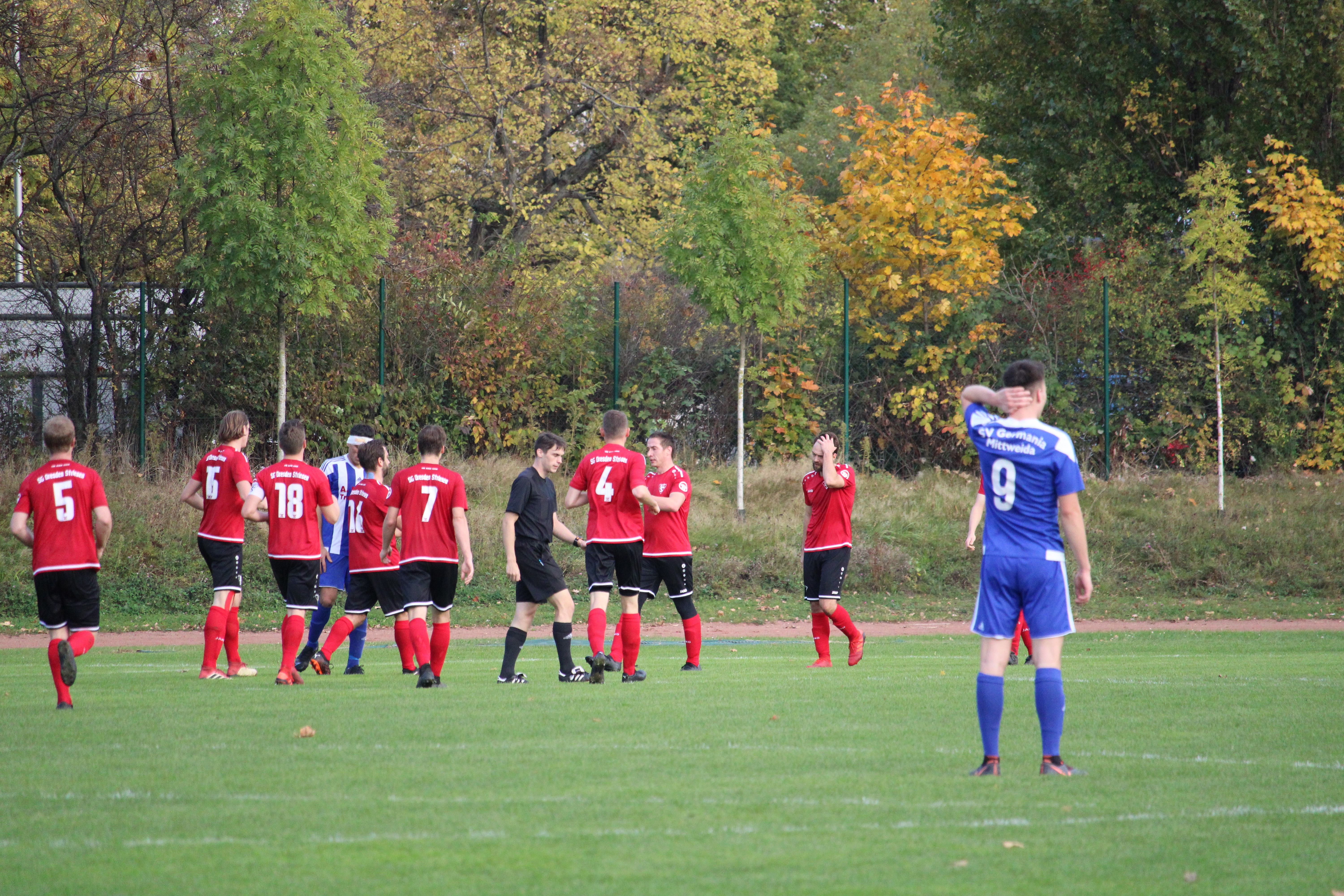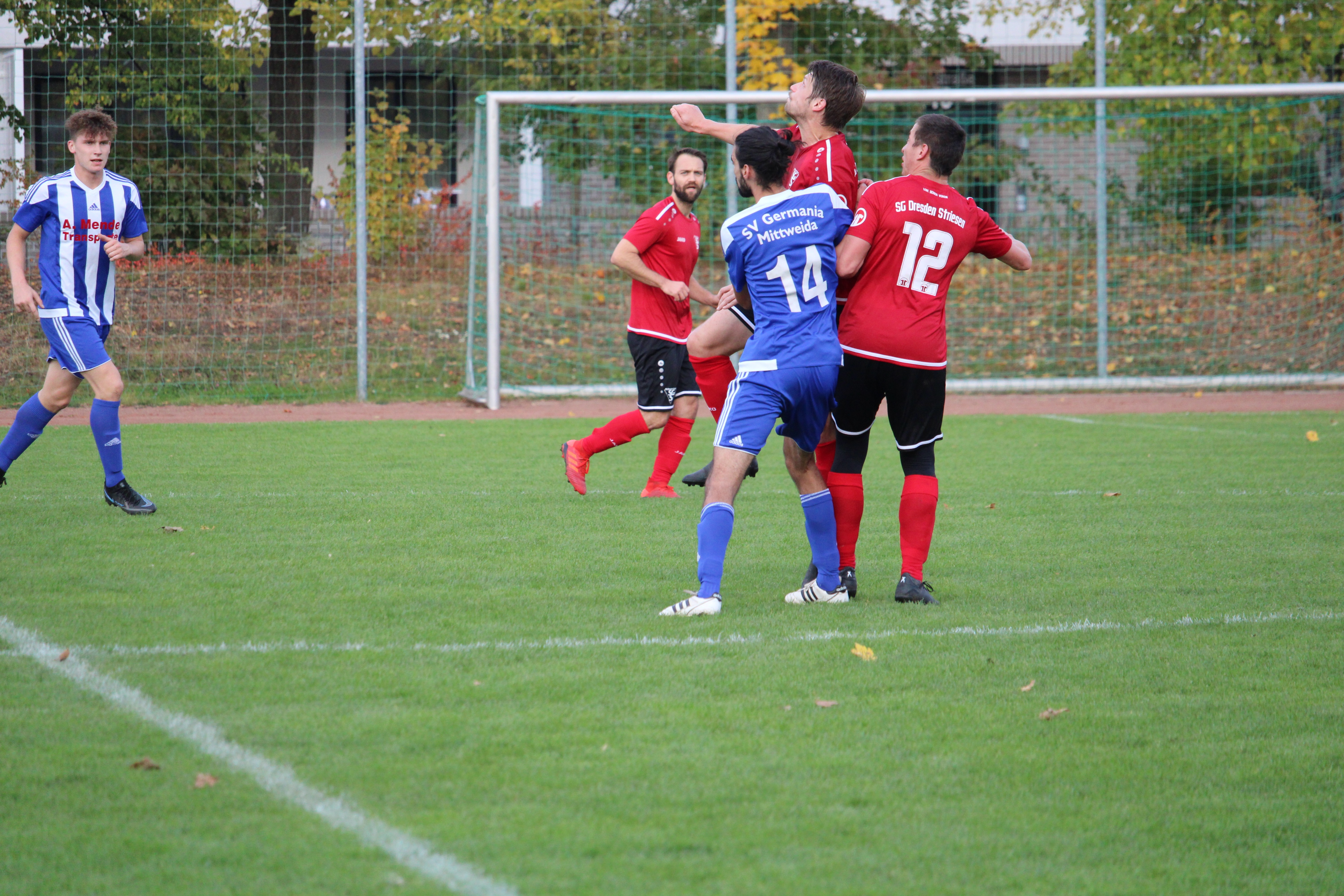 Bei herrlichem Herbstwetter sich zwischen beiden Mannschaften zunächst eine zähe Partie. Viele Mittelfeldduelle prägten die Szenerie und verlangten Spielern sowie dem Schiedsrichtergespann alles ab. Auch auf Grund einer konzentrierten Abwehrleistung waren Torraumszenen eher rar gesät. Die erste Chance im Spiel besaß Maximilian Dietze, der in der zwölften Minute geschickt wurde und den Ball knapp am Tor vorbeispitzelte. Aber auch die Gäste konnten sechs Minuten später gefährlich vor dem Tor auftauchen. Nach einem Chipball in den Strafraum konnte Christian Kunath den Abschluss aus kürzester Entfernung entschärfen. Heiß her ging es schließlich in den letzten Minuten des ersten Durchgangs. Zunächst legten unsere Mannen vor. Eine Hereingabe von der linken Seite konnte Dietze direkt vor dem Tor zur Führung nutzen (45.). Dies nahmen die Mittweidaer zum Anlass in der Nachspielzeit auf das Tempo zu drücken und alles nach vorn zu werfen. Dabei kamen sie per Kopf wenige Sekunden nach dem Treffer per Kopf zum Abschluss, welcher vom Querbalken gestoppt wurde.