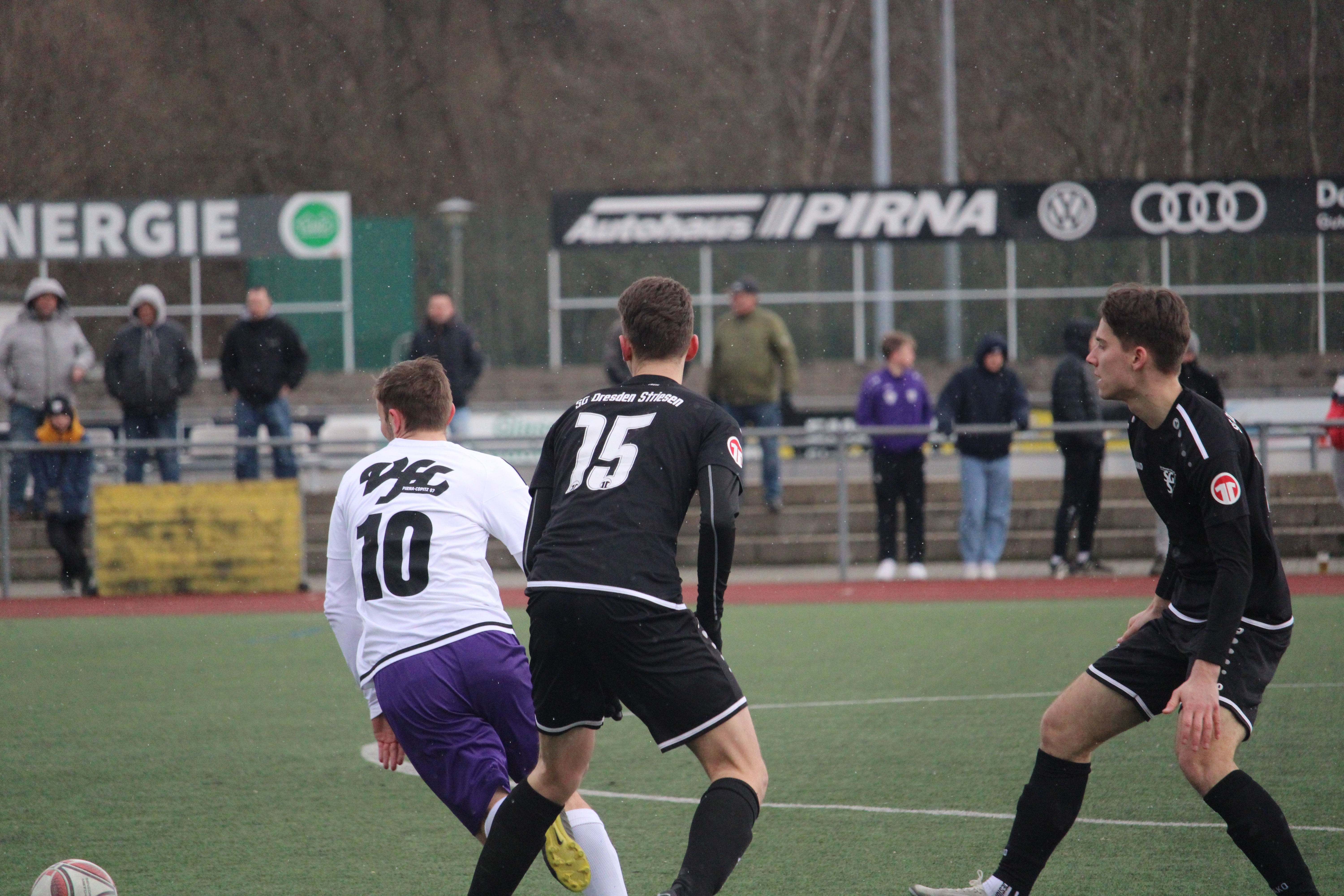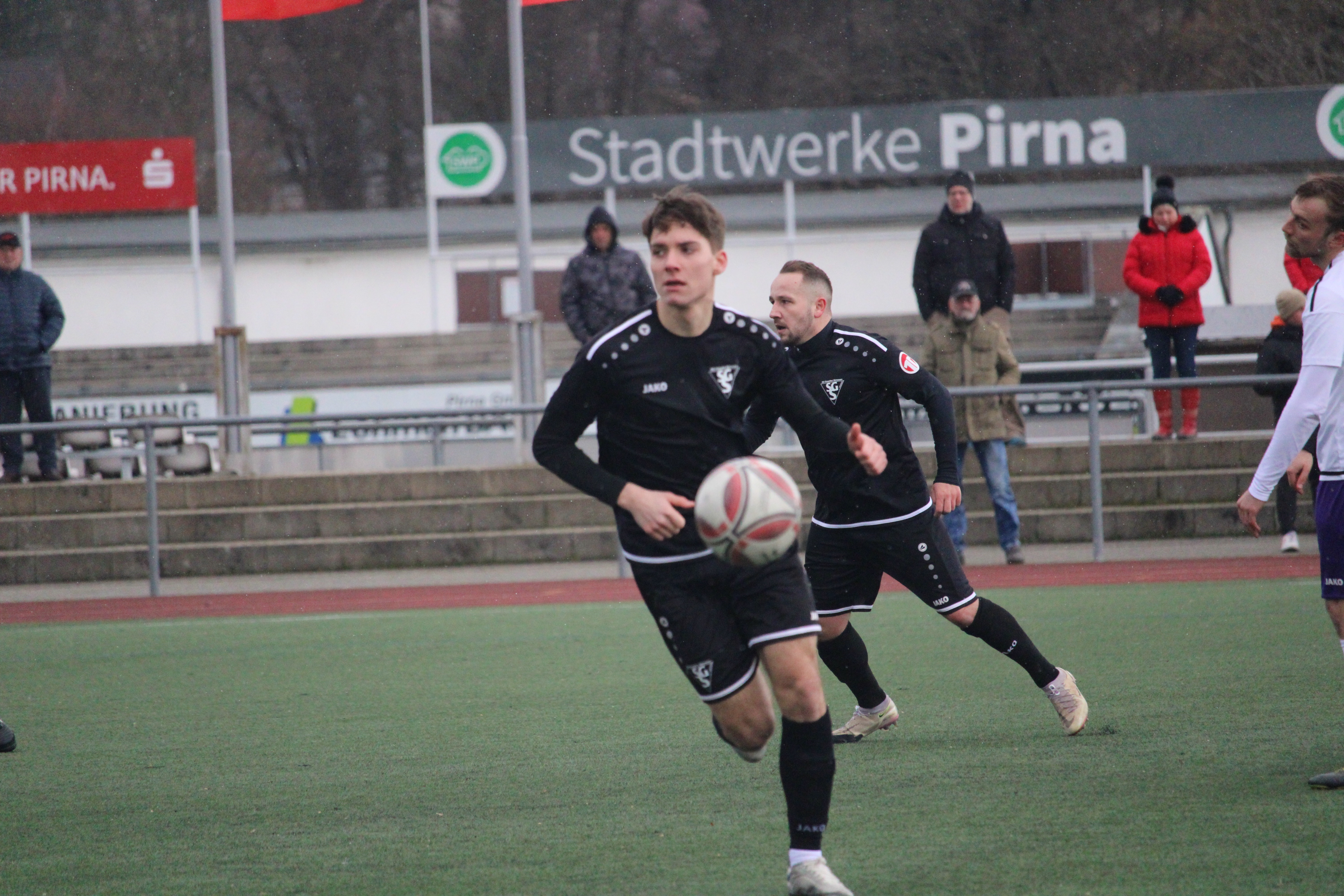 Auf Grund der vorherrschenden Witterungsbedingungen konnte nicht wie geplant auf dem Rasen gespielt werden und es wurde auf den Kunstrasenplatz ausgewichen. Vielleicht ein Wechsel, welcher Gutes verheißen sollte. Die Partie begann zunächst recht beschaulich. Der VfL Pirna-Copitz konnte sich zwar optische Feldvorteile erspielen, doch mit einer konzentrierten Abwehrarbeit gelang es den Unseren die Angriffsbemühungen im Keim zu ersticken. So liefen die Anfangsminuten auch dahin und die Hausherren besaßen nach einer Viertelstunde eine erste Torannäherung, welche das Ziel aber verfehlte. Dafür hatte es dann der erste Torschuss der Partie in sich. Und dieser kam von unseren Mannen. Bei einem schnellen Gegenstoß machte sich Levin Thäsler auf in Richtung gegnerischen Strafraum, wo er kurz davor einen Verteidiger aussteigen ließ und zum mitgelaufenen Arno Stephan ablegte, der sicher zur umjubelten Führung traf (19.). Nun war es an die Hausherren, welche die Schlagzahl erhöhten und direkt zu einem Abschluss kamen. Doch Niko Karger packte eine überragende Parade aus und verhindert einen Einschlag. Auch nach einer guten halben Stunde war er gleich doppelt zur Stelle und zwei Abschlüsse aus kürzester Distanz abwehrte. Umso unglücklicher, dass er in der 35. Minute einen Elfmeter verursachte nachdem er anstatt dem Spielball nur einen gegnerischen Fuß erwischte. Beim anschließenden Strafstoß war er dann machtlos und die Copitzer kamen zum Ausgleich. Bis zur Pause gestaltete sich dann das überwiegend Bild, dass die Hausherren zwar mehr Ballbesitz für sich verzeichneten, aber an der umsichtig agierenden Striesener Verteidigung nicht vorbeikamen. Hingegen besaßen unsere Mannen nach einem Konter sogar noch die Chance auf einen Treffer. Eine flache Hereingabe verpasste der heranrauschende Robert Hendrich denkbar knapp.