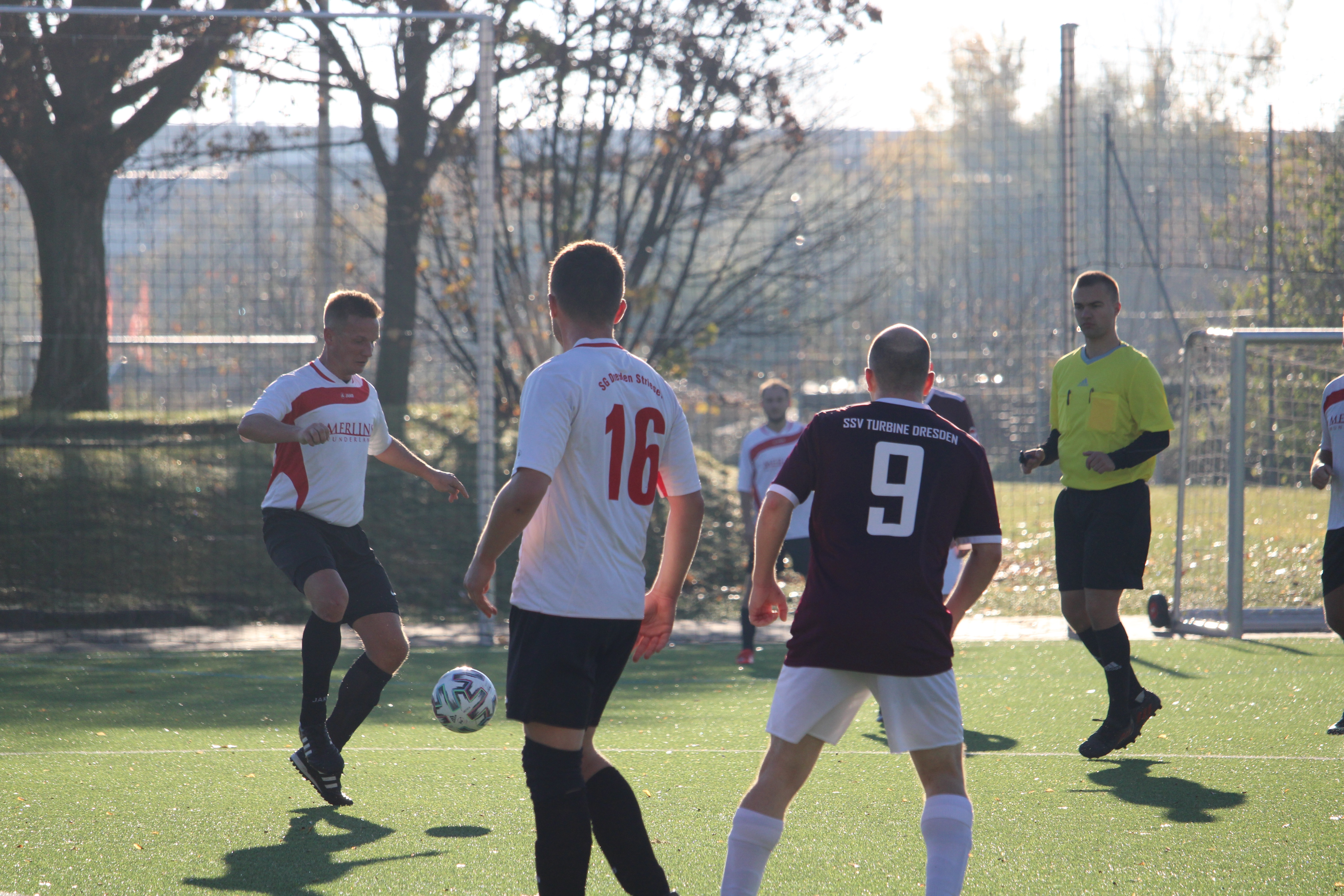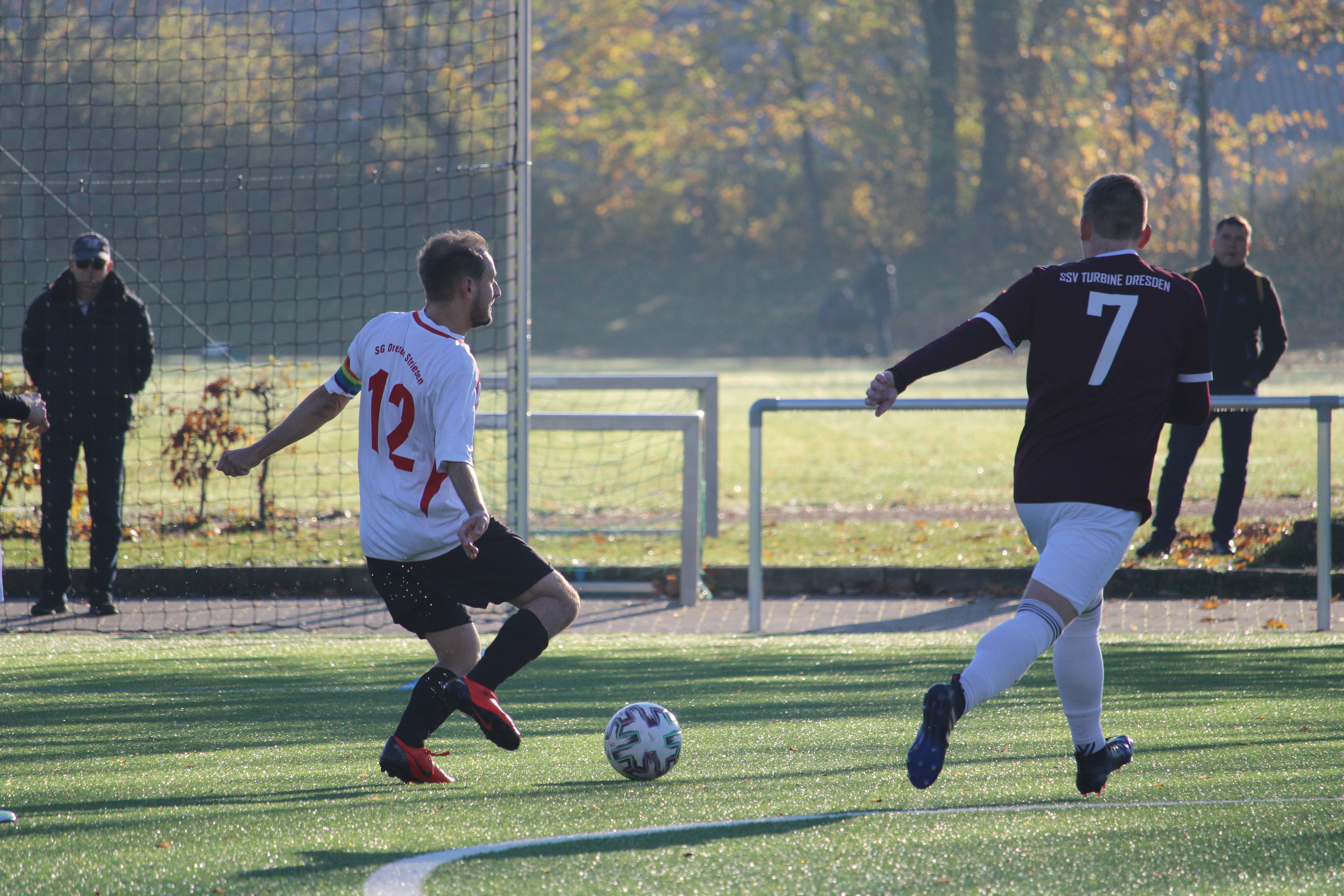 Dabei begegnete man sich mit der Dritten des SSV Turbine Dresden auf Augenhöhe und niemand gab keine Zentimeter preis. Trotzdem konnte unsere Dritte die ersten Torannäherungen für sich verbuchen. Doch der erste Treffer der Partie fiel auf der anderen Seite. Ein Schuss aus knapp zwanzig Meter fand den Weg in den rechten oberen Winkel. Danach hatten unsere Mannen unter anderem durch Paul Weise und Mathias Branig den Ausgleich auf dem Fuß bzw. Kopf. Jedoch fand der Ball nicht den Weg ins Tor. Anders die Gäste, welche kurz vor der Pause nachlegten. Eine Flank von links konnte Bjarne Beck nicht festhalten und beim nachfassen erwischte er leider ein Gäste. Beim anschließenden Strafstoß war er dann machtlos.
