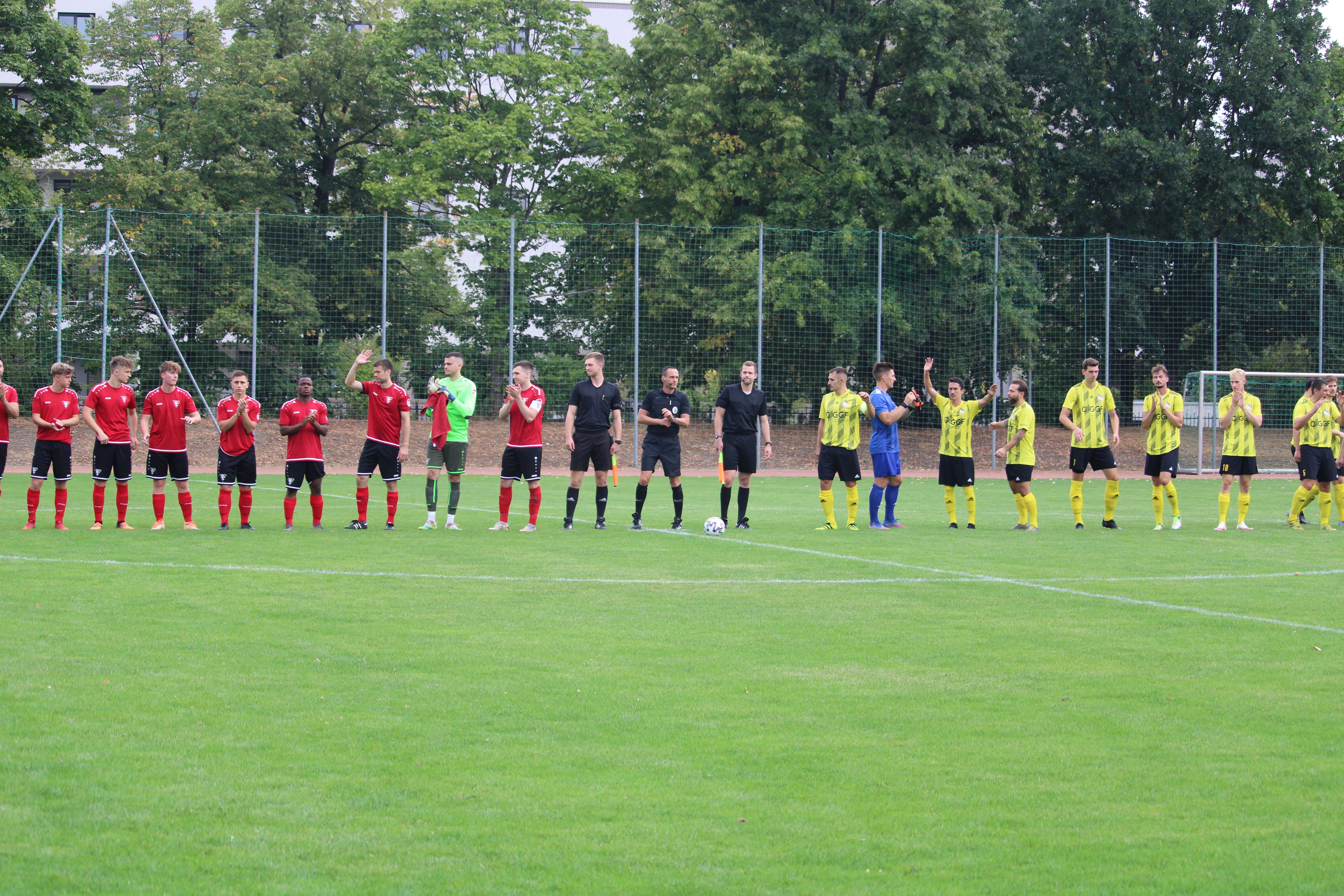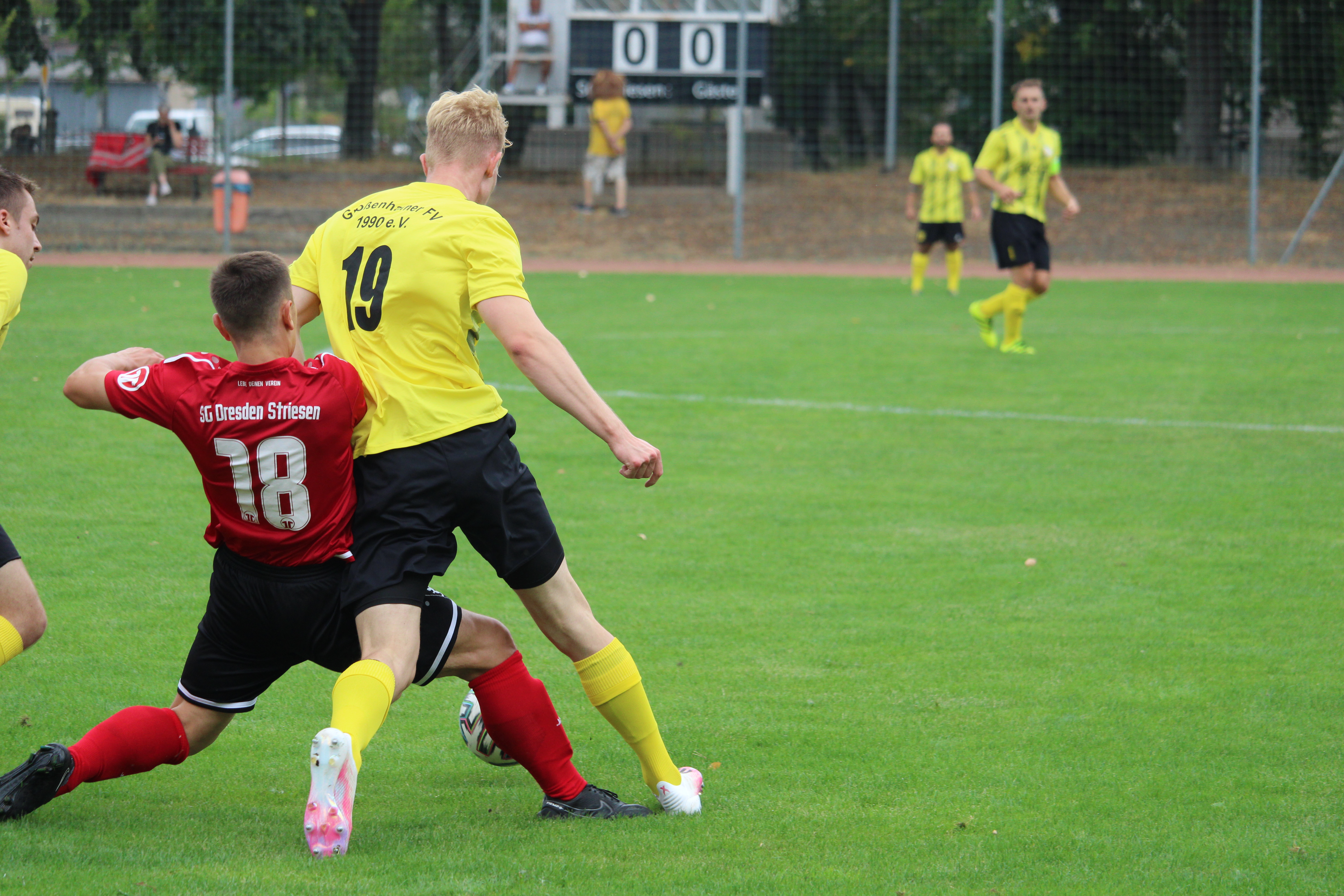 Von Beginn an zeigten die Großenhainer, dass sie nicht lange fackeln und gleich Taten für sich sprechen lassen wollen. So übernahmen die Gäste gleich das Zepter und behielten das Spielgerät über weite Strecken in ihren Reihen. Das vorgegebene Tempo stellte unsere Mannen vor eine große Aufgabe, um die volle Angriffswucht Großenhains abzuwehren. Schon in der zweiten Minuten kam man nach einer Hereingabe von links im Strafraum zum Abschluss, jagte das Leder aber über das Gehäuse. Die Gäste blieben weiter druckvoll und konnten bereits in der neunten Minuten den Führungstreffer erzielen. Ein Pass durch die Schnittstelle ein Angreifer stand frei vor Keeper Nico Karger, dieser konnte im ersten Versuch noch abwehren, war dann aber machtlos. Nur wenige Augenblicke später hätte Großenhain direkt den nächsten Treffer nachlegen können. Ein langer Ball fand an der Strafraumgrenze einen Abnehmer, der drei Verteidiger aussteigen ließ und am glänzend parierenden Karger scheiterte. Im weiteren Verlauf blieben die Gäste weiter tonangebend, doch mit zunehmender Dauer konnten sich unsere Mannen vermehrt aus der Umklammerung befreien und selbst kleine Nadelstiche setzen. Einer davon traf in der 25. Minute. Thäsler konnte einen Fehler im Aufbauspiel Großenhains ausnutzen und den Ball stibitzen. Beim Abschluss nahm er den Pfosten zu Hilfe und traf zum Ausgleich (25.). Von diesem Treffer zeigte man sich beflügelt und die gegnerischen Angriffsbemühungen konnten in Schach gehalten werden. Einzig vor der Pause sorgte eine Ecke, welche per Hacke weitergeleitet wurde für große Gefahr. Karger war hier wieder zur Stelle.