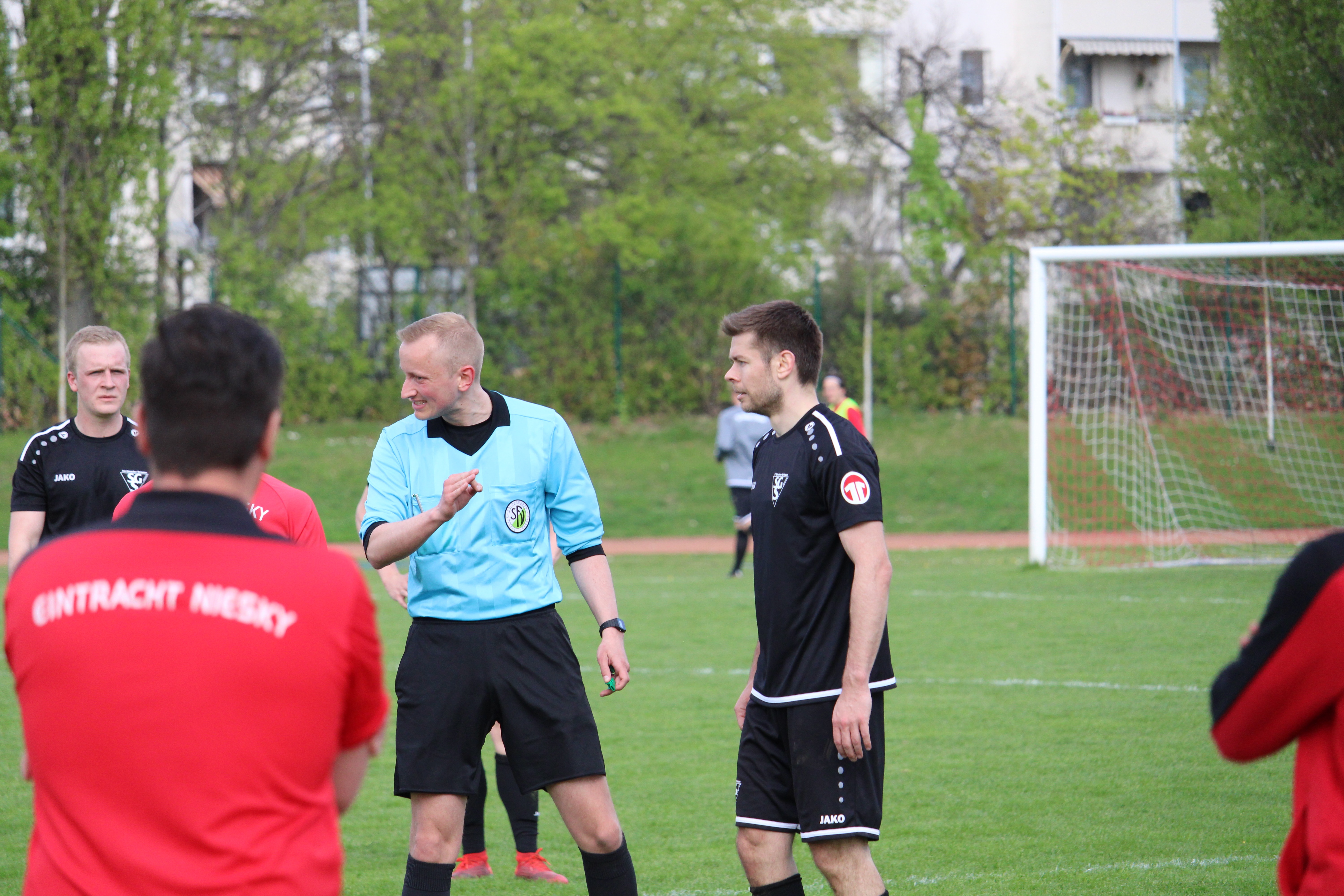 Beiden Mannschaften war die Wichtigkeit der Partie anzuerkennen und so agierten die Teams zunächst abwartend, sodass sich die Partie meist zwischen den Strafräumen abspielte. Im Laufe des Spiels waren es unsere Mannen, die sich zuerst aus der Deckung wagten und nach zwölf Minuten eine erste Chance für sich verzeichnen konnten. Nach einer Freistoßhereingabe von Philipp Reimann köpfte Marco Grahl den Ball denkbar knapp über das Gehäuse. In der zwanzigsten Minute versuchte es Reimann dann direkt und stellte den Gästekeeper auf die Probe. Kurz darauf hatte Tim Kausch per Kopf die nächste Chance. Auch Maximilian Dietze durfte sich versuchen, scheiterte aber am Schlussmann (37.). Unsere Verteidigung zeigte über die gesamte Hälfte eine konzentrierte Leistung und konnte mit einer energischen Leistung die Angriffsbemühungen Nieskys im Keim ersticken. Einzig in der Anfangsphase musste Christian Kunath ernsthaft eingreifen.