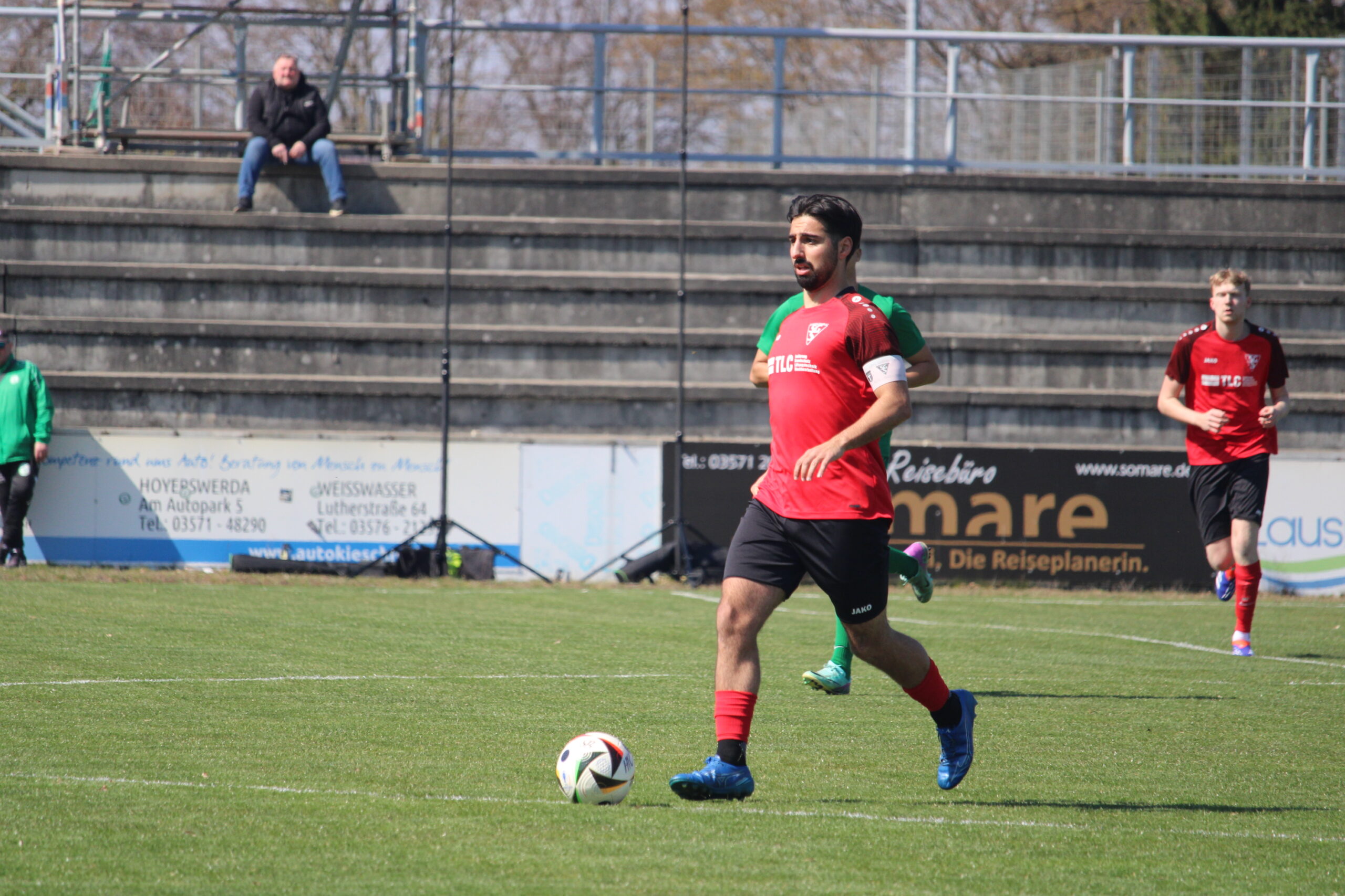 Von Beginn an lief der Ball durch die Striesener Reihen und man versuchte das Spielgeschehen zu gestalten. Dies lief auch sehr gut und so spielte sich die Partie meist in der Hälfte der Hoyerswerdaer ab. Und schon nach drei Minuten konnte ein erstes Zeichen gesetzt werden. Phillip Schweizer bringt den Ball zu in den Strafraum zu Eric Zimmermann, der aus einem etwas zu spitzen Winkel am Keeper scheitert. Sechs Minuten später war es Sebastian von Gahlen, der im Strafraum auftauchte, aber keinen Druck hinter seinen Abschluss bekam. Die Hausherren kamen in dieser Phase nur vor das Striesener Tor, wenn man schludrig spielte. So in der 13. Minute, als man den Ball im Spielaufbau vertändelte und einem schnellen Konter gegenüberstand, welcher gefährlich nah am Tor vorbeiging. Danach ging es wieder in die andere Richtung. Nach einem langen Ball von Tom Blazek kam Schweizer im Strafraum frei zum Abschluss, welchen er aber komplett verzog (18.). Im Anschluss war es eine Einzelaktion von Tim Schröter, die für Gefahr sorgte. Nach einem Einwurf nahm er den Ball und dribbelte sich in den Strafraum, wo er fast ungestört zum Abschluss kam und die Latte traf. In der 25. Minute kamen die Hoyerswerdaer erneut über einen Konter gefährlich in den Striesener Strafraum, aber Yannick Born passte auf und spitzelte den entscheidenden Pass aus der Gefahrenzone. Drei Minuten später war es dann Levin Thäsler, der im Strafraum zu Fall gebracht wurde. Den fälligen Strafstoß verwandelte Tim Schröter, nachdem zwischenzeitlich der Rasensprenger anging, mit etwas Verzögerung sicher zur Führung. Im weiteren Verlauf agierte man weiter recht abgeklärt, auch wenn in den letzten Minuten Christian Kunath als Keeper zweimal eingreifen musste.