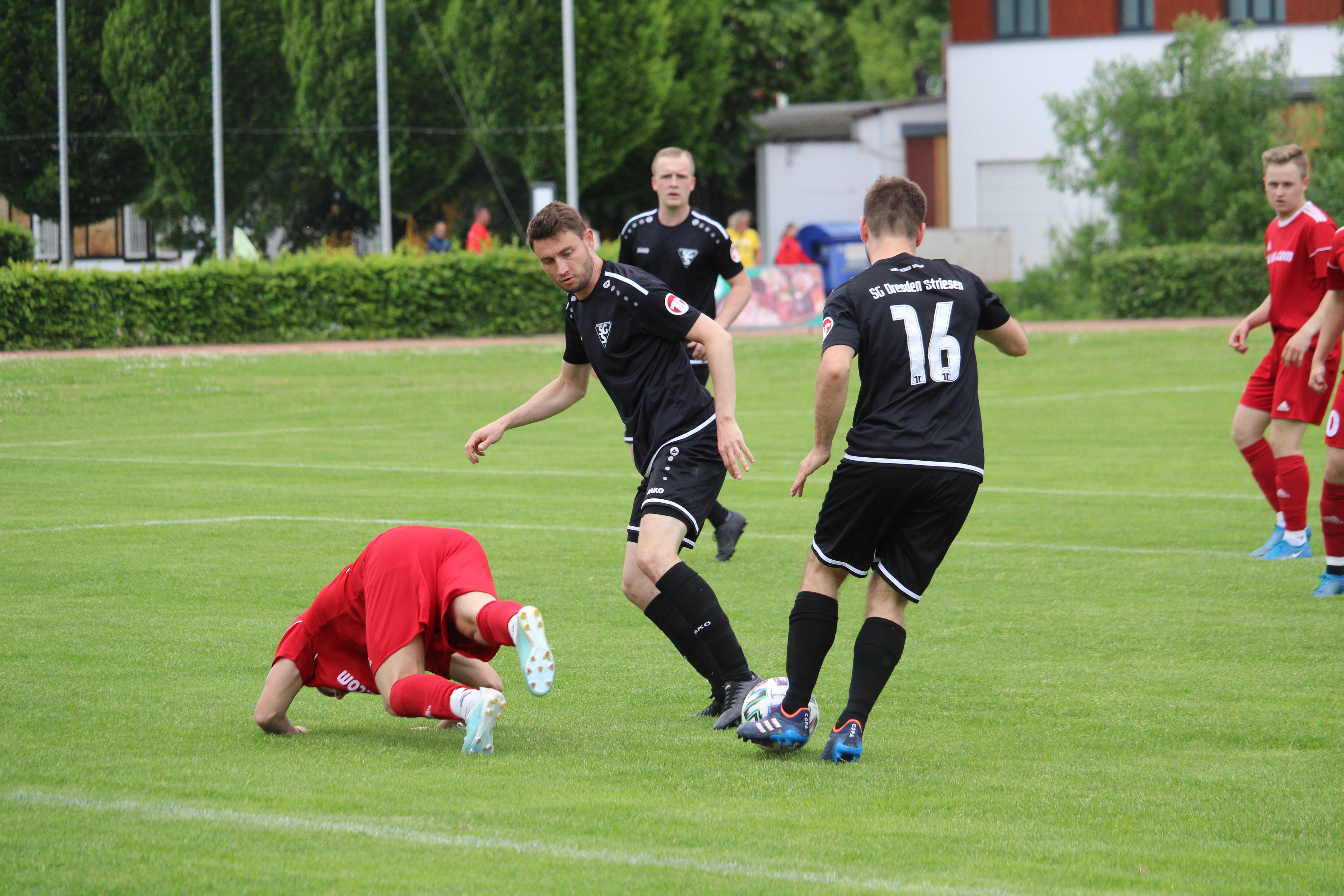 Eine andere Partie bekam man dann im zweiten Durchgang zu sehen. Zwar besaßen die Hausherren nach einem Konter die erste Chance im zweiten Durchgang, doch im Anschluss waren es unsere Mannen, die die Spielkontrolle übernahmen und vermehrt auf den Ausgleich drückten. Nach einer guten gespielten Stunde sollte sich dies auch in erste Torchancen ummünzen. Den Anfang machte Ricardo Lehmann, der von Christian Irmscher bedient wurde und frei zu Abschluss kam. Doch sein Versuch wurde noch gerade so noch von der Linie gekratzt (59.). Es dauerte nicht lange bis man die nächste Chance auf dem Fuß hatte. Philipp Opitz treibt den Ball nach vorn und spielt einen Steilpass zu Akoa Manga, der zum mitgelaufenen Florian Hornig ablegt. Im letzten Moment wurde dieser aber noch am Abschluss gehindert (62.). Direkt in der nächsten Aktion sorgte ein Ecke für Gefahr. Irmscher bekam am langen Pfosten den Ball und verfehlte denkbar knapp das Gehäuse. Nach einer weiteren Ecke scheiterte in der 70. Minute Toni Stelzer per Kopf am Keeper und der heranstürmende Karl Kowaltschik verfehlte knapp den Abpraller. Bis zum Schluss zeigte sich das gleiche Bild. Immer wieder war es unsere Erste, die großen Druck ausübte und die Gäste in die eigene Hälfte zurückdrängte. In der Schlussphase der Partie kam man dann auch weiter zu guten Möglichkeiten. Nach einer Flanke von Marc Bullmann konnte Gonzales-Sousa den Schlussmann nicht per Kopf überwinden (83.). Der erlösende Treffer sollte dann per Freistoß fallen. Drei Minuten vor dem Ende brachte der kurzzuvor eingewechselte Franz Lampe den Ball im unteren Eck unter. In den verbleibenden Minuten besaß Striesen sogar noch die Chancen die Partie als Sieger zu beenden. So scheiterte in der 90. Minute Hornig am herauseilenden Schlussmann und in der Nachspielzeit hieß es für Hornig erneut Endstation Gästekeeper.
