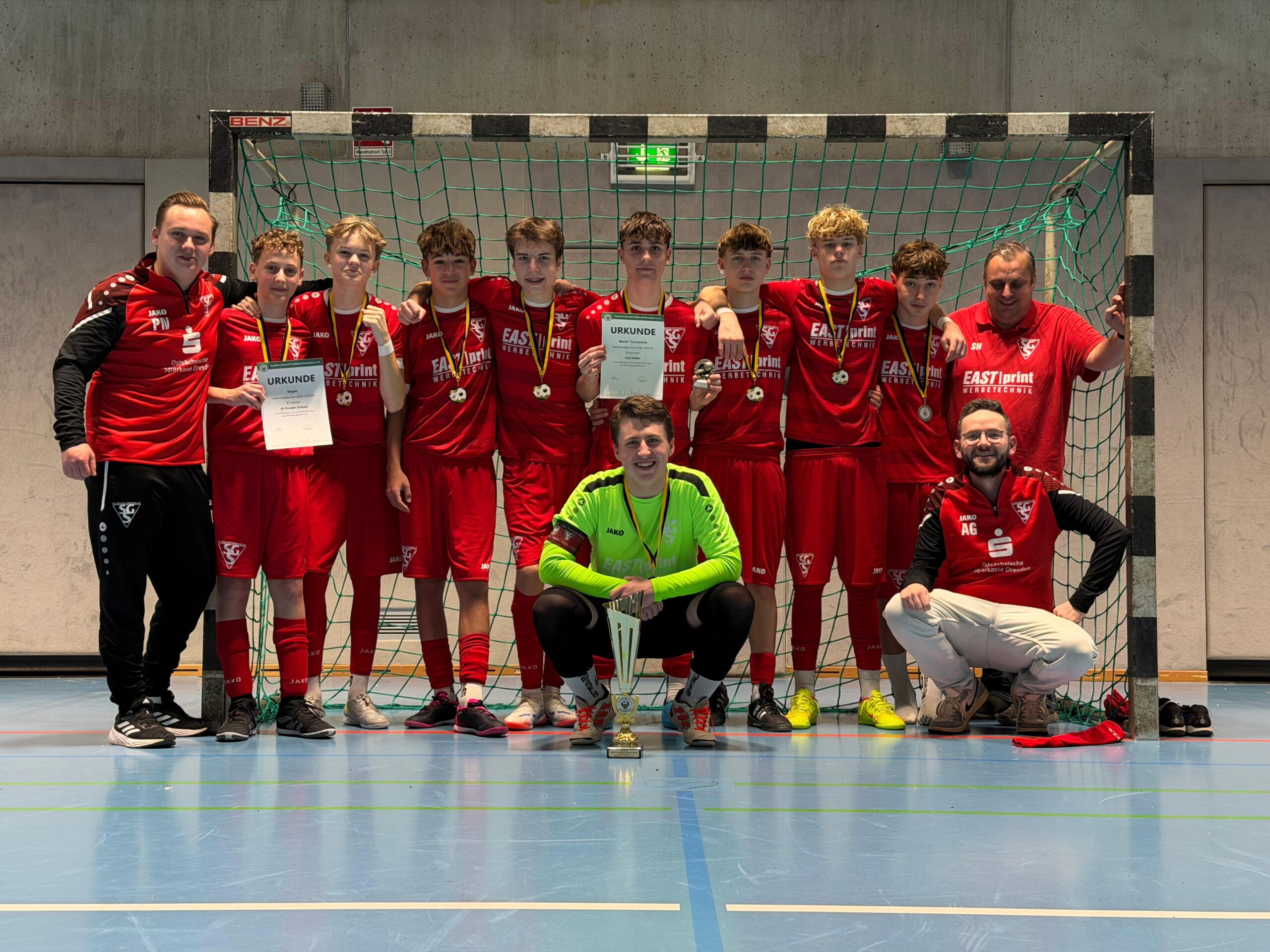 Unsere B-Jugend (U17) hat sich bei den Hallenstadtmeisterschaften 2026 in Dresden eindrucksvoll den Titel gesichert. In einem intensiven und emotionalen Turnierverlauf zeigte das Team große Moral, spielerische Entwicklung und echten Zusammenhalt.